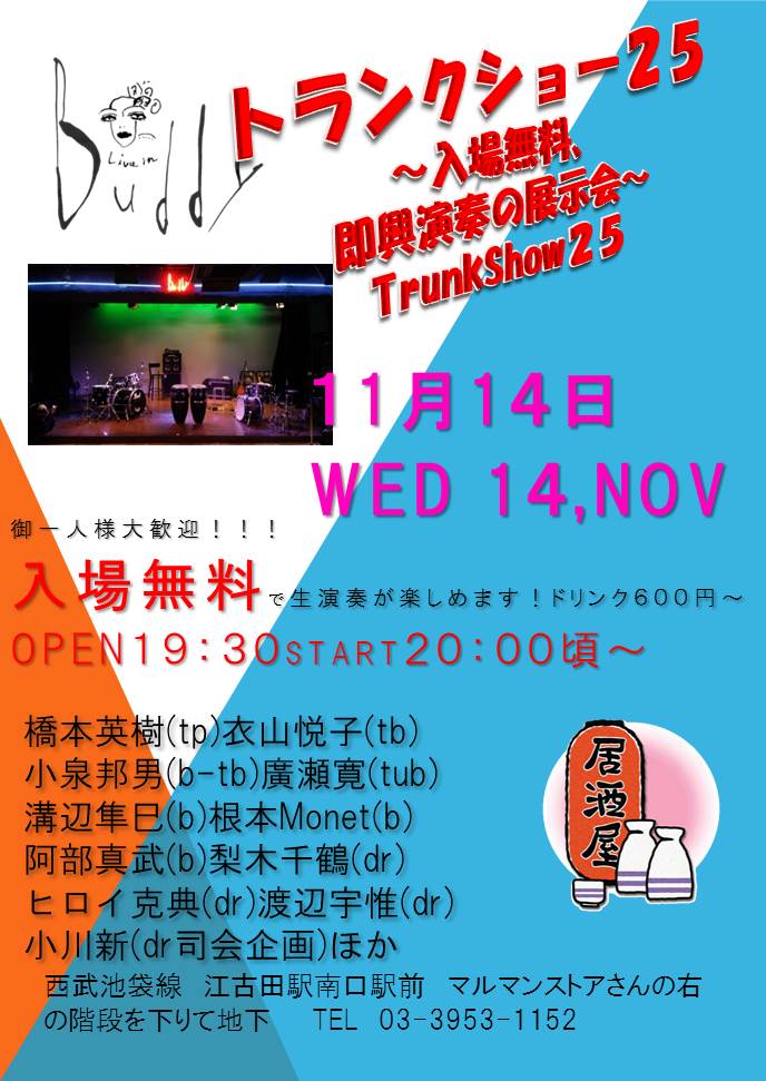 JUGEMテーマ:ライブ告知 11月20日 入場無料です。 江古田バディ 「トランクショー25〜入場無料、即興演奏の展示会〜」 open19:30start20:00 定期的に開催しているシリーズ企画です。 「即興演奏?難しいんじゃない?、、、」 という方が多いとお聞きします。 でも、聴きに来ていただきたい! 聴けば、わかります。 そこで、入場無料で様々な演奏者を 組み合わせてお届けいたします。 各25分ずづつぐらいです。 「展示会」ですので、お気に入りの ミュージシャンを見...