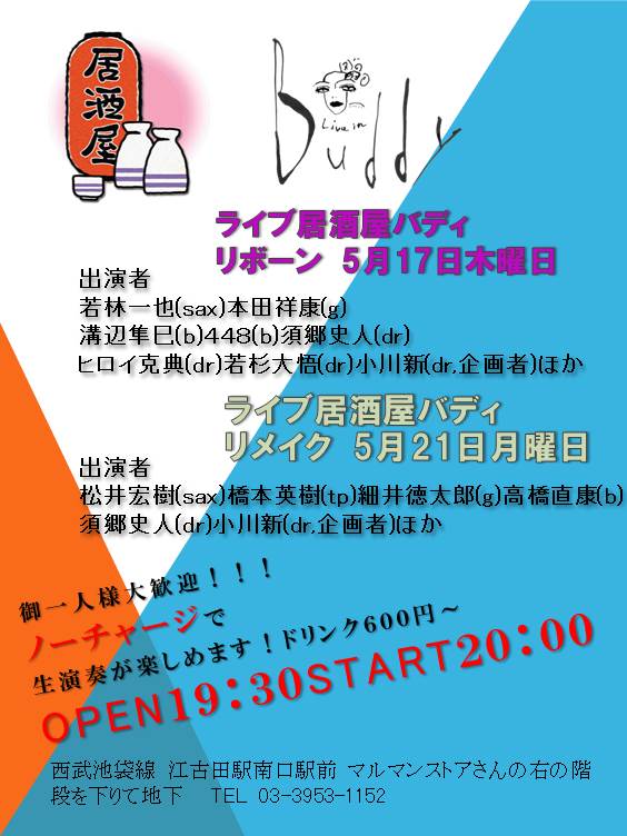 JUGEMテーマ:ライブ告知 5月17日木曜日 は西武池袋線、江古田駅南口EVでてすぐ、の Live inn Buddyにて 僕の企画 「入場無料!ライブ居酒屋バディ リボーン」 を開催します。 オープン19:30 スタート20:00 若林一也(sax)本田祥康(g) 溝辺隼巳(b)448(b)須郷史人(dr) ヒロイ克典(dr)若杉大悟(dr)小川新(dr,企画者)ほか 今回はドラマーが4人いるので 2組のドラムを出して、組み合わせを 考えたいと思って...