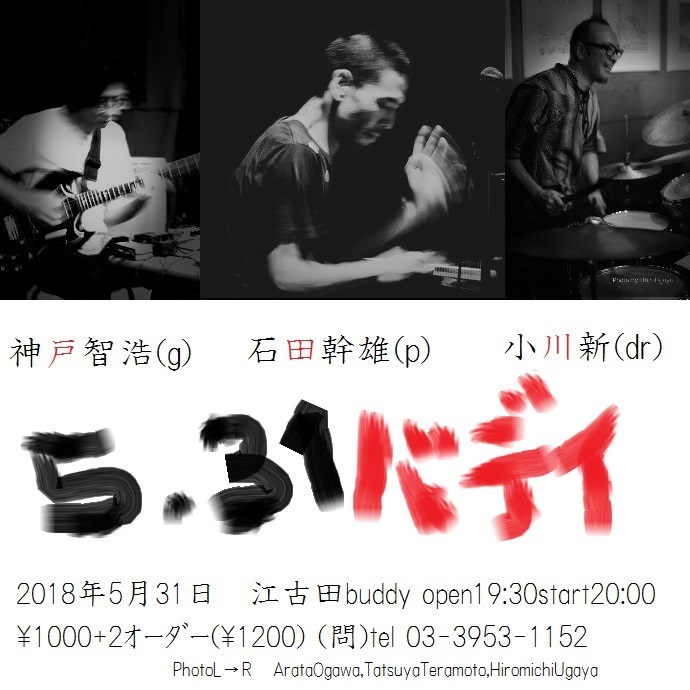 JUGEMテーマ:ライブ告知 2018年5月31日木曜日 江古田南口駅前 すぐ の スーパーマルマンストアさんの横の階段を降りる Live in Buddy open19:30start20:00 神戸智浩g 石田幹雄p 小川新dr 僕自身、2度神戸石田duoを観にいってるのですが 素晴らしい内容で。 今回、お誘いいただいて 嬉しいやら楽しみやら でもそれより、ビビってるというか緊張してる方の 配分が多いかな。 演りはじめれば、音を奏で響か...