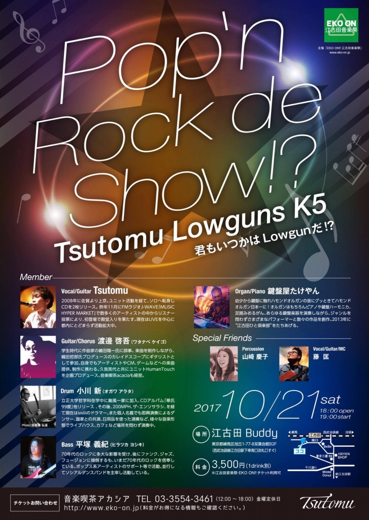 JUGEMテーマ:ライブ告知 2017年10月21日土曜日 西武池袋線 江古田南口駅前 LIVE in buddy TsutomuLowgunsK5 Pop'n Rock de Show!? 〜君もいつかはLougunだ!?〜 EKO-ON ポップス枠 Tsutomuのオリジナル、カバー曲を演奏します。 ?事前予約:3000円+1ドリンクオーダー要(EKO ONチケット割引) ?当日:3500円+1ドリンクオーダー要(EKO ONチケット利用可) 【チケット先行受付】 江古田Buddy 03-3953-1152 音楽喫茶ア...