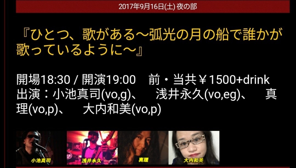 9月16日(土曜日) 碑文谷アピア40 『ひとつ、歌がある〜弧光の月の船で誰かが歌っているように〜』 開場18:30 / 開演19:00 前・当共¥1500+drink 出演:小池真司(vo,g)+浅井永久(g)+小川新(dr)+アベヒロシ(b) 浅井永久(vo,eg) 真理(vo,p) 大内和美(vo,p) 【住所】東京都目黒区碑文谷5-6-9 B1 【TEL】03-3715-4010 http://apia-net.com/ アピアさんは素敵な雰囲気で料理もおいしくリーズナブル! 是非お越しくださ...