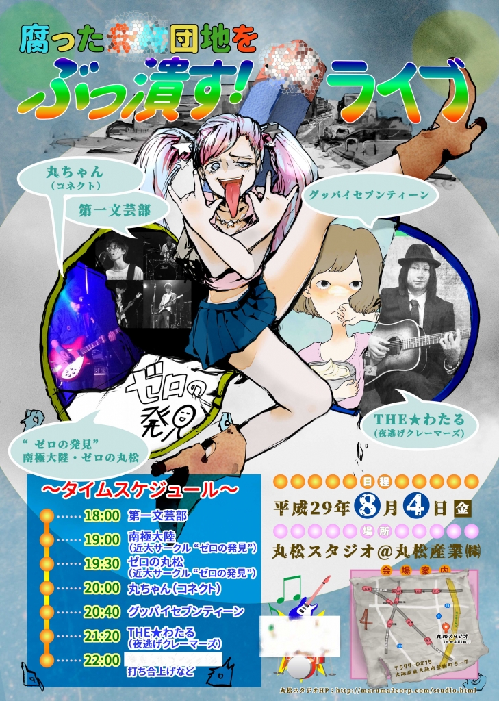 JUGEMテーマ:ライブ告知 こんにちは。丸松産業株式会社です。 2017年8月4日(金)にて、当社のスタジオでライブを行います。 野外のフリーライブになります。 ライブタイトル:腐った○○団地をぶっ潰す!ライブ 場所:丸松産業株式会社 丸松スタジオ(丸松産業株式会社で検索するとわかります。アクセス方法はググって下さい) 料金:無料 時間:18:00〜22:00 出演者:第一文芸部/南極大陸(ゼロの発見)/ゼロの丸松(ゼロの発見) 丸ちゃん(コネクト)/グ...