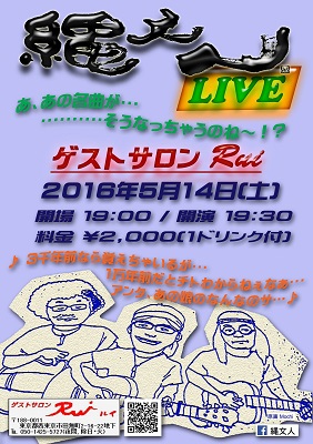 JUGEMテーマ:ライブ告知 どもども、サワヤマです。 先週の土曜日(5/14)、田無にあるゲストサロンRuiにて行われた、縄文人のライブにお越し頂き、ありがとうございました。 あれからもう1週間経つんですね〜。 フライヤ。イラスト by モッチ 当日録音した音源を聴いてみたんですけどね。 楽しんでいただけたようで、よかったです。聴いてて結構笑っちゃいました。 自分たちのパフォーマンスなのにねぇ。 始まる前にビールを1杯だけ 19:30スタートの予定が15分押しで始まり・・始まり・・ これが当日の...