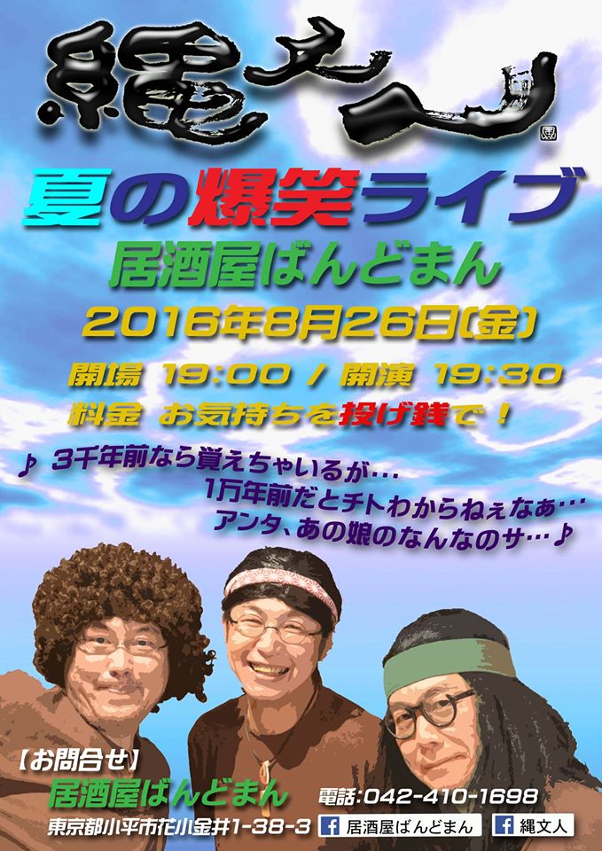 JUGEMテーマ:ライブ告知 どもども、サワヤマです。 何なんでしょうか、台風10号。南下したと思ったら再び北上。観測史上初の北関東か東北に上陸って、オリジナリティありすぎやろっ!キミはっ! それはさて置き。 先週金曜日(2016年8月26日)に、地元の居酒屋「ばんどまん」で行われた縄文人のライブ、『夏の縄文人』にお越し頂いた皆様、ありがとうございました。 イベント名「夏の縄文人」なんてどこにも書いてないけど(笑) 『縄文人』の...