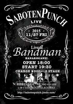 JUGEMテーマ:ライブ告知 どもども。サワヤマです。 この週末(2015/11/27〜29)は、いい天気でしたね。冬になると空気が澄んでいて、晴れた夜は月が煌々と輝いて見えるから、見応えがあるというか、迫ってくるような感じがいいですねぇ。 さて、またまたライブのご報告でございますが。 11/27(金)に、サワヤマが住んでいる地元の居酒屋『ばんどまん』で行われた、サボテンPUNCHのライブ。お越しいただきありがとうございました〜! 20人入ると酸欠状態になりそうな小体なお店ですが(笑)、15〜6名のお客様がアットホ...