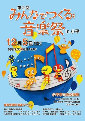 JUGEMテーマ:ライブ告知 どもども、サワヤマです。 今日(2015年12月7日)は二十四節気の『大雪(たいせつ)』ですね。山の峰はすっかり雪に覆われて、北国では山だけではなく、平地でも根雪になる雪が降り始めるころ、とされていますが、今年は暖冬らしいですね。個人的には暖かいのはありがたいんですけどね。スキー場などは大変だという話もちらほら・・・。 さて、12/5に小平の中央公民館で行われた『第2回 みんなでつくる音楽祭 in 小平』。サワヤマ、替え歌フォークユニット『縄文人』で参戦してまいりましたよ。 2...