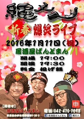 JUGEMテーマ:ライブ告知 どもども、サワヤマです。 何とも今日(1/12)は寒いですね。まさに寒の内。これが冬の寒さだ〜!!って言われているような感じ。 いや、今年は暖冬だねとは思ってましたが、やっぱり雪がちらつくレベルの寒さはちょっと違いますね。 それはさて置き。 昨日、西武新宿線「花小金井駅」から徒歩3〜4分のところにある『居酒屋ばんどまん』で行われた、『縄文人』の新春爆笑ライブ。お陰様で満員のお客さまにお越しいただいて、盛況でございました。ありがとうございます!! 自分たちで「爆...