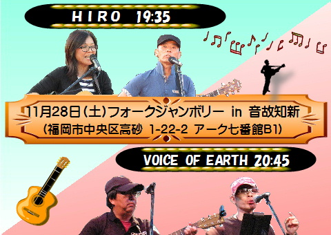 JUGEMテーマ:ライブ告知 音楽なんて無縁な生活をしていたのですが、3年ほど前にアコースティックギター弾き語りと出会いました。なんかね〜、胸に沁みて来るんですよ。もちろん上手な人は格別ですが、そうじゃなくても…。アマチュアライブなので小さな会場ですし、客一人一人に届けようという思いが伝わってくるんです。そんな素晴らしさを感じさせてくれるライブを二つ、ご紹介。 「音故知新」ライブの出演は、この他に2組予定されております。 クリスマスイブは天神で温かいサウンドを→詳細・お申し込みは...