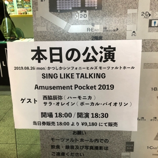 十何年ぶりにSING LIKE TALKINGのライブに行きました。 結婚してから一人で夜出るのはためらわれるので、 ずっと行けませんでした。 しかし追加公演にかつしかシンフォニーヒルズ! うちの最寄駅から2駅という近さなので、 ダンナも一緒に行くということで実現。 ゲストにハーモニカ奏者の西脇辰弥さんとサラ・オレインちゃん。 前もって知ってたので、ハーモニカの入ってる曲と サラちゃんのデュエット曲はダンナに教えておきました。 家から近いもんで、早めに来てグッズを見ます。 パンフと西村さ...