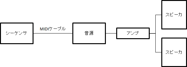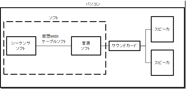 JUGEMテーマ:DTM さてさて、本題に入る前におさらいを。 前回お話ししたDTMの最小構成はこんな感じでした。 普通のパソコンならサウンドカードとスピーカーは付いていますので、残るはソフトウェアの準備という事になります。 更に、Windowsパソコンの場合、実は「Microfoft GS Wavetable Synth」というMIDI対応のソフトウェアシンセサイザー(音を合成する音源ソフト)が標準でついています。これ1つで一度に16個の音を鳴らせるマルチティンバー音源です。これを鳴らすだけであれば仮想MIDIケーブル...