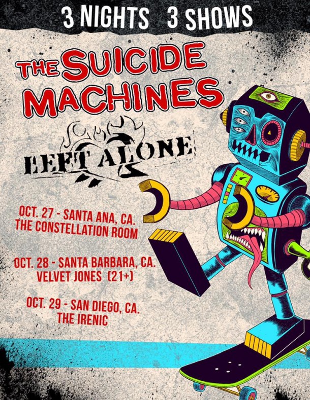Sat October 29th 2016 The Suicide Machines w/ Left Alone, The Bombpops @The Irenic San Diego, CA 私をパンクに目覚めさせたバンド、The Suicide Machineが10年ぶりに西海岸へ戻ってきた! 2006年、ツアー真っ最中の中突然解散した彼等。解散後も地元デトロイトでのBlack Christmas Showや、Warped Tour、その他のフェスで再結成をしてはいたものの、どのショーも東海岸よりで中々観に行く事が出来なかったファンも多いはず。そんなファンが溢れているであろうカリフォルニアでのツアー決...