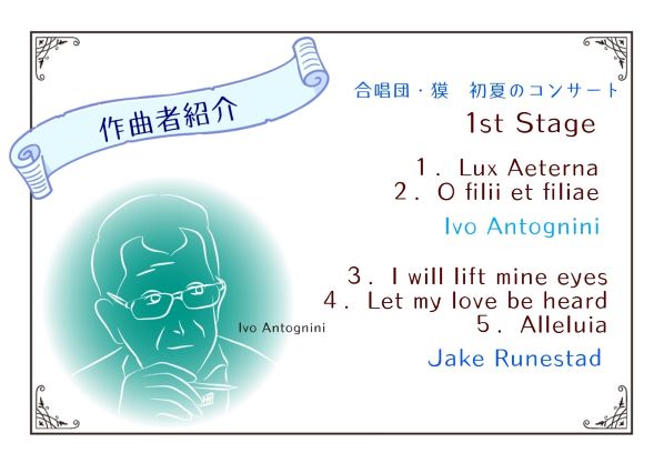 JUGEMテーマ:合唱 担当・アルトかな Ivo Antognini スイスの作曲家・ピアニスト。1963年生まれの方なのであと3年くらいで還暦…なのですが、この人、“ぴちぴち”の合唱作曲家です。 日本の合唱雑誌「ハーモニー」掲載インタビューによると、アントニーニさんが合唱音楽に目覚めたのは2006年のこと。きっかけは、それまでほとんど関心のなかった合唱の演奏会を聴きに行ったことで、『「なんだこれは!」と衝撃を受け...