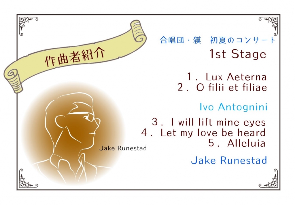 JUGEMテーマ:合唱 担当・アルトかな Jake Runestad ジェイク・ランスタッド、1986年生まれの作曲家。どことなくテナーのまっさんに似ていると団内で囁かれている。「眉毛らへんが似てる」とか、「おでこじゃない?」とか、諸説ある模様。本当に似ているかどうかは、演奏会のステージにてお確かめください♪ 〜END〜 …ウソです、ごめんなさい。ENDじゃないです。でももう書くことがないの〜(T_T) だ...