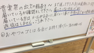 JUGEMテーマ:合唱 今日は、久しぶりに市民会館で練習。新体制になり、担当が変わりました。 出欠係になったNさんが、係の人にホワイトボードを貸してくださいと言われました。そしてササッと書かれたのがこれ! 今回のメールで返信がなかった場合は、以後の連絡がなくなるとのこと。きっちりとした性格のNさん。 これだったらみんなすぐにメールしそうです。連絡なくなったら困ります(>_<) いきなりみんなの顔が引き締まりました。 少し疲れ気味の方もい...