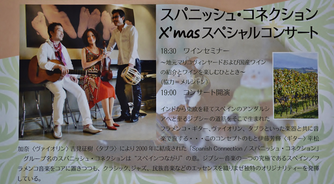 JUGEMテーマ:お気に入りクリスマスプレゼント、何欲しい? 今年はすでにクリスマスプレゼントを貰った♪聞きたかったアーティスト「スパニッシュ・コネクション」のコンサートに行くことができた。しかも私の日常行動範囲内でコンサートが開かれたのだ。仕事帰り、アフターファイブで行ける距離で聴けるとはなんとも有難い!某酒造メーカーのワインセミナーが30分ほどあり、その後のコンサートだった。車で行ったので、ワインは飲めなくて残念だったが、今回はスパコネのコンサートが目的だったので、そちらで十二分に酔わせて貰った...