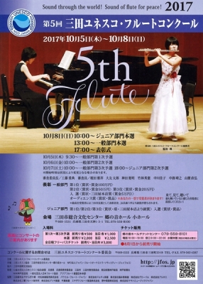 こんにちは、ミヤザワフルートアトリエ東京です☆ 本日は 『第5回 三田ユネスコ・フルートコンクール』についてのお知らせです。 日 程:2017年10月5日(木)〜10月8日(日) 会 場:三田市総合文化センター 郷の音ホール 小ホール 【参加資格】 1982年10月9日以降の出生者で、国籍及び学歴は問わない。 【参加定員】 100名 【参加申込み期間】 2017年7月7日(金)〜9月1日(金) 消印有効 【参加料】 30,000円(内500円は三田ユネスコ協会への寄付) ※その他...