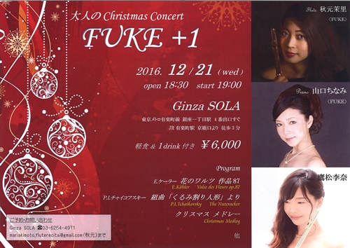 こんにちは、ミヤザワフルートアトリエ東京です☆ 本日はコンサートのお知らせです♪ 『大人のChristmas Concert FUKE+1』 日 時:2016年12月21日(水) 開 場:18:30 開 演:19:00 会 場:Ginza SOLA 料 金:軽食&1drink付き 6,000円 出 演:Flute 秋元茉里、Piano 山口ちなみ、Flute 鷹松李奈 ご予約・お問い合わせ Ginza SOLA TEL 03-6264-4971 mariakimoto.fluterecital@gmail.com(秋元)まで ...