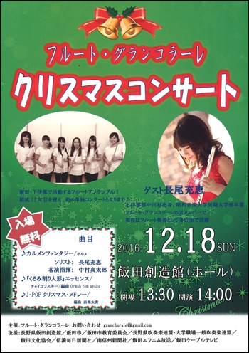 こんにちは、ミヤザワフルートアトリエ東京です☆ 本日は長野県飯田市でのコンサートのお知らせです♬ 『フルート・グランコラーレ クリスマスコンサート』 日 時:2016年12月18日(日) 開 場:13:30 開 演:14:00 会 場:飯田創造館(ホール) ※入場無料♪ お問い合わせ granchorale@gmail.com ミヤザワフルート飯島工場がある長野県。 フルート・グランコラーレは長野県飯田・下伊那で活動する フ...