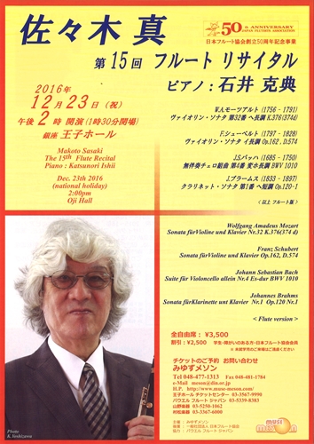 こんにちは、ミヤザワフルートアトリエ東京です☆ 本日はコンサートのお知らせです♪ 『佐々木 真 第15回フルートリサイタル』 日 時:2016年12月23日(祝) 場 所:銀座 王子ホール 開 場:13:30 開 演:14:00 全席自由 3,500円 割引 2,000円(学生、障がいのある方、日本フルート協会会員) チケットのご予約 お問合せ みゆずメソン 048-477-1313 東京交響楽団の首席フルート奏者を25年間務...