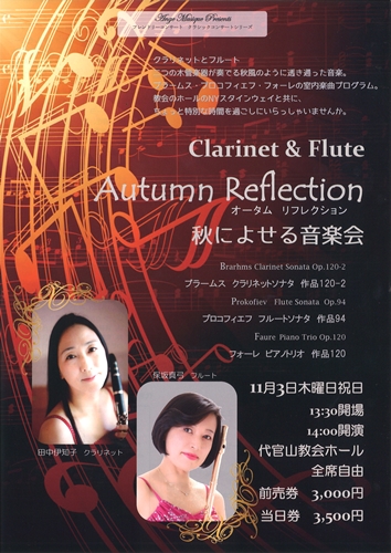 こんにちは、ミヤザワフルートアトリエ東京です☆ 本日はコンサートのお知らせです♪ 『Autumn Reflection 秋によせる音楽会』 日 時 2016年11月3日(木)祝日 開 場 13:30 開 演 14:00 会 場 代官山教会ホール 全席自由 チケット 前売券 ¥3,000 当日券 ¥3,500 出 演 Flute: 保坂 真弓 Clarinet:田中 伊知子 お問い合わせ アンジェミュジ−ク 芸術の秋 フルートとクラリネッ...
