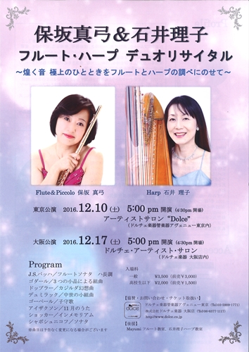 こんにちは、ミヤザワフルートアトリエ東京です☆ 本日はコンサートのお知らせです♬ 保坂真弓&石井理子 『フルート・ハープ デュオリサイタル 〜煌めく音 極上のひとときをフルートとハープの調べにのせて〜』 【東京公演】 日時 2016年12月10日(土) 開場 16:30 開演 17:00 会場・お問合せ アーティストサロン”Dolce"(ドルチェ楽器管楽器アヴェニュー東京内) 【大阪公演】 日時 2016年12月17日(...