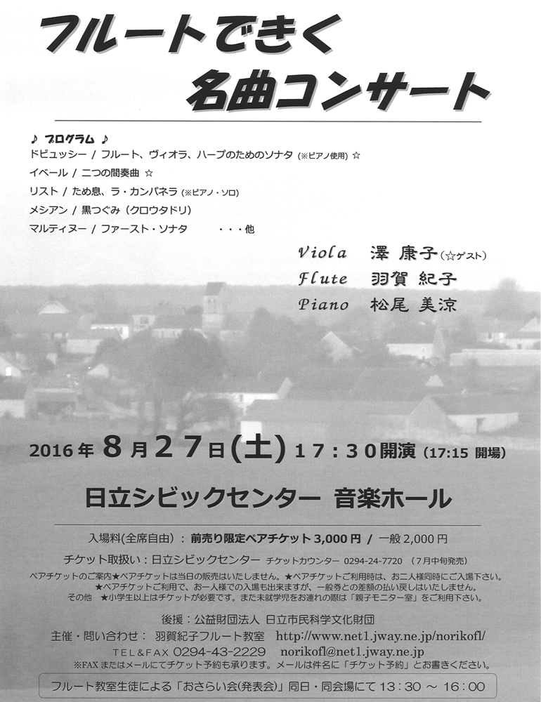 こんにちは、ミヤザワフルートアトリエ東京です☆ 今日は日立市でご活躍の羽賀紀子先生のコンサートをご紹介します! 羽賀紀子先生にはミヤザワフルートの★ハンドメイドTHモデル★をご愛用いただいております。 2016年8月27日(土) 開演 17:30(開場 17:15) 会場 日立シビックセンター音楽ホール チケット ¥2,000(一般)/¥3,000(前売り限定ペアチケット) 【 出演 】 Flute:羽賀 紀子 Viola:澤 康子(★ゲスト) Piano:松尾 美涼 メシアンの黒つぐみは正式にはクロウタドリと...