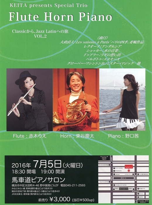 こんにちは、ミヤザワフルートアトリエ東京です☆ 今日の夜、横浜の馬車道ピアノサロンで赤木りえ先生のコンサートがあります♪ 赤木先生にはミヤザワフルートのAZスペシャルをご愛用いただいております。 お仕事帰りにでも少しジャズに触れてみてはいかがでしょうか。 2016年7月5日(火) 開場 18:30 開演 19:00 会場 馬車道ピアノサロン チケット ¥3,000(当日¥3,500) 【 出演 】 Flute:赤木 りえ Horn:東谷 慶太 Piano:野口 茜 フルートとホルンとピアノの作品はそんなに多くないのです...