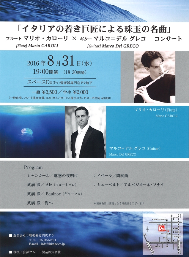 こんにちは、ミヤザワフルートアトリエ東京です☆ この夏、マリオ・カローリ先生が来日されてコンサートがあります♪ マリオ・カローリ先生にはミヤザワフルートの★プラチナモデル★をご愛用いただいております。 2016年8月31日(水) 開場 18:30 開演 19:00 会場 スペースDo(ドゥ)管楽器専門店ダク地下 チケット ¥3,500(一般)/¥2,000(学生) 【 出演 】 Flute:マリオ・カローリ Mario CAROLI Guitar:マルコ=デル グレコ Marco Del GRECO 今年は武満徹さんの没後20周年ということ...