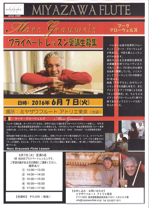 こんにちは、ミヤザワフルートアトリエ東京です☆ 6月7日(火) マーク・グローウェルズ個人レッスンを開催いたします! ベルギー出身の世界的フルーティスト。 モンス王立音楽院名誉教授。年100回もの公演を全世界で行っている。 アストラ・ピアソラ作曲の名曲「タンゴの歴史」はピアソラがグローウェルズに捧げた曲というエピソードは広く知られている。 Miyazawa SBR 9K使用。 1レッスン50分 料金は15,000(税抜) 通訳付きです。 13:00より5枠設けています。 会場はミヤザワフルートアトリエ東京 &darr...