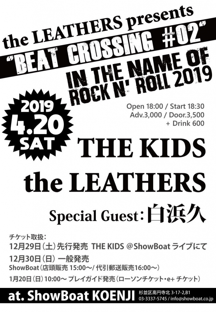 JUGEMテーマ:LIVE the LEATHERS presents... "BEAT CROSSING #02" IN THE NAME of ROCK N' ROLL 2019 2019年4月20日(土) at ShowBoat (高円寺) 出演:THE KIDS, the LEATHERS, 白浜久 開場 18:00/開演 18:30 前売¥3,000/当日¥3,500(税込・別途ドリンク代¥600) ☆一般発売☆ ■ShowBoat 12月30日(日)発売 店頭販売/電話・メール予約&代引注文(毎日14:00〜23:00受付) ■プレイガイド 1月20日(日)10:00〜発売 ローソンチケット [ Lコード:取得次第発表 ] イープ...