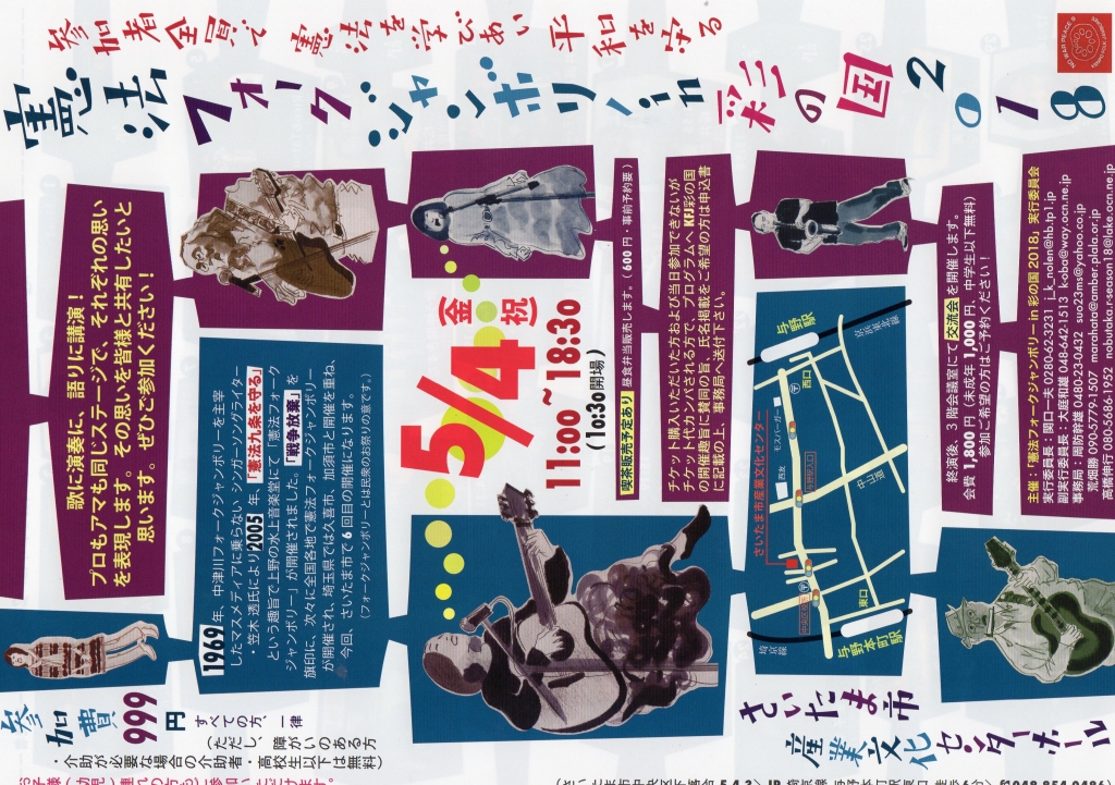 ♪憲法フォーク・ジャンボリー♪今年も開催します。 5月4日(金祝)11:00〜 さいたま市産業文化センターホール (JR埼京線与野本町駅東口徒歩6分) 参加費999円... チケット購入者及びジャンボリーの趣旨に賛同しカンパ(999円)をいただいた方で、希望される方の氏名をパンフレットに掲載します。皆さまのご参加・ご協力をよろしくお願いします。 JUGEMテーマ:LIVE