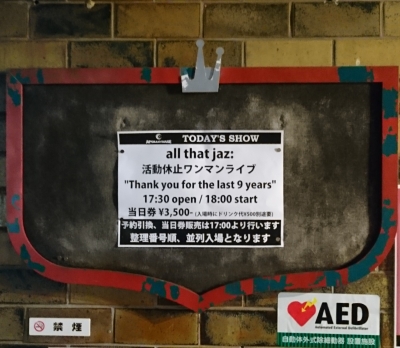 ここ1週間、左後大腿部の痛みと花粉症にやられています。。。 もうマジでイヤです。。。 という事で、3月25日ですが、all that jaz:の活動休止前ワンマンライブ"Thank you for last 9 years"に行ってきました。 先月に続いての名古屋遠征でした! ライブ当日の朝、ここ1、2週間のバタバタ生活の寝不足による疲れで予定時間に起きれず・・・。 さらに、あまりにも寒いので、前日準備していた服を急遽変更。。。 結局、ライブハウスには17時30分くらいに着くだろ...