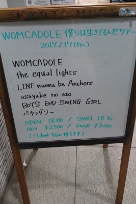 平日ですが、京都MUSEへ行ってきました! 平日、京都でライブを見るというのは、翌日休日じゃないと出来ません。。。 本当こういうのって、1年間に1度あるかないかです。 WOMCADOLEのツアーなのですが、自分の中のメインは、千葉のバンドBOYS END SWING GIRLでした。 現状、彼らが関西でライブをするというのは限られています。 ですので、ここを逃すとしばらくライブを見る事が出来ないので、この日のライブを確実に確保したい気持ちが強かったです。 必死で頑張っても...
