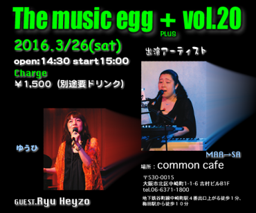 シンガーソングライター 大阪 MAA→SAのブログです もう、来週の話なのですが ライブで歌わせて頂くことになりました The music egg+(plus) LIVE 2016 vol.20 facebookイベントはこちらです 日時:2016年3月26日(土) Open 14:30 Start 15:00 チャージ:¥1,500 ※1ドリンク別途要 場所:common cafe 〒530-0015 大阪市北区中崎西1-1-6 吉村ビルB1F http://talkin-about.com/ 地下鉄谷町線 中崎町駅 4番出口から徒歩約50m 各線梅田駅からも徒歩圏内です。(アク...