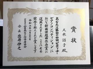 JUGEMテーマ:ピアノ教室/音楽教室 全日本ピアノ指導者協会より、第44回ピティナピアノコンペティション新曲課題曲作品賞の賞状が届きました。 今年はコロナの影響でコンペティションは中止となったのに、今までと変わらず作品賞を授与して下さいました、ピティナの皆様には感謝の気持ちでいっぱいです。 本当にありがとうございました。 これからも子どもたちの心に響く作品を創れるよう、精進して参ります! 2020年度 新曲課題曲作品賞についてはこちらをどうぞ→https://compe.piano.or.jp/2020/08/2020-250.html ...