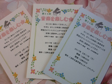 JUGEMテーマ:ピアノ教室/音楽教室 これまで 地元文化会館 また 隣市にある県の施設 また私営ホールなどで 400〜500名収容できる施設での 発表会を行ってきましたが 今年は 地元文化会館が 改修工事で開催不可能なため お世話になる楽器店さんに 開催していただけることになりました。 早速 お嫁ちゃん作のご招待状が 完成です!! 2パターン 印刷用紙も3種類 ピアノちゃん ピアノ君が おじいちゃま おばあちゃま お...