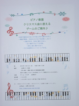 JUGEMテーマ:ピアノ教室/音楽教室 先日 少しご紹介した クリスマス会に使えるゲームのご案内企画の チラシができました。 子育て支援活動でも 活用しているものや オリジナルゲーム また 簡単にできる 音楽ビンゴのご提案など 盛りだくさん。 ぜひ 皆様の 貴重なひとときにご利用いただけると うれしいです。 いつもブログにお越しくださりありがとうございます。 今日もこちら↓をクリック...