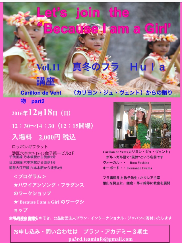 JUGEMテーマ:バンド活動あれこれ 冬がきましたね 街がきらめき始めました そんな冬にハワイアンソングをやっちゃいます 今年もプラン・インターナショナル・ジャパンさんのPRイベントに呼んでいただきました。 "Because I am a girl" 途上国の女の子支援のキャンペーンです。 昨年はボサノバクリスマスでしたが、今年はHokule'a 井上敦子先生を迎えて真冬のフラでございます 真冬のフラ〜ハワイアンソング&フラ(Hulaミニ講座) ...