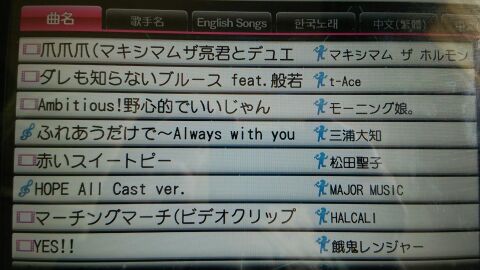 【2015年03月08日の日本カラオケ競技会】 2015/03/08 00:00:39 夕焼け雲(生音) / 千昌夫 △2位 ★99.465点★ 2015/03/08 00:05:07 夕焼け雲 (プロオケ)(生音) / 千昌夫 ◇3位 97.704点 2015/03/08 00:09:58 アケミという名で十八で / 千昌夫 ☆1位 92.349点 2015/03/08 17:35:35 恋の風車 / チェリッシュ ◇3位 96.222点 2015/03/08 17:39:46 白いギター(生音) / チェリッシュ ◇3位 95.912点 2015/03/08 17:43:40 てんとう虫のサンバ(生音) / チェリッシュ ◇3位 94.171点 2015/03/08 17:47:50 避暑地の恋 / チェリッシ...