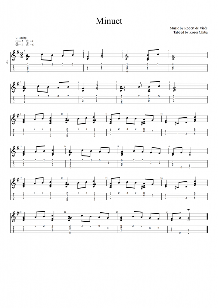 JUGEMテーマ:楽器 ロベール・ド・ヴィゼー (Robert de Visée, 1650年頃−1725年)は、フランスのテオルボ奏者、ギター奏者、作曲家。ルイ14世の宮廷音楽家として、テオルボやギターのほかリュート、ヴィオールを奏し、歌手も務めた。また、リュート、テオルボおよびギターのための曲を作曲した。(ウィキペディアより) ロベール・ド・ヴィゼーの『メヌエット』をウクレレ用にアレンジしてみました。