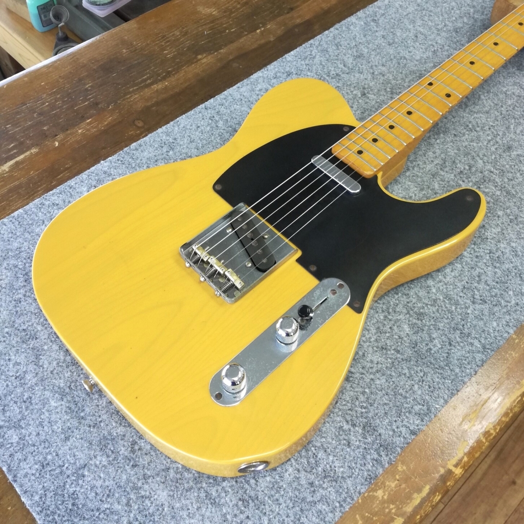JUGEMテーマ:楽器 ■フェンダー・ジャパン・テレキャスター’82のブリッジ・サドル交換やフレットすり合わせなどを行いました。 音程を合わせや安くするために、段差がついたテレキャスター用のブリッジ・サドルに交換しました。 そして、フレットすり合わせやナット交換、ジャック交換を行い、セットアップ調整いたしました。