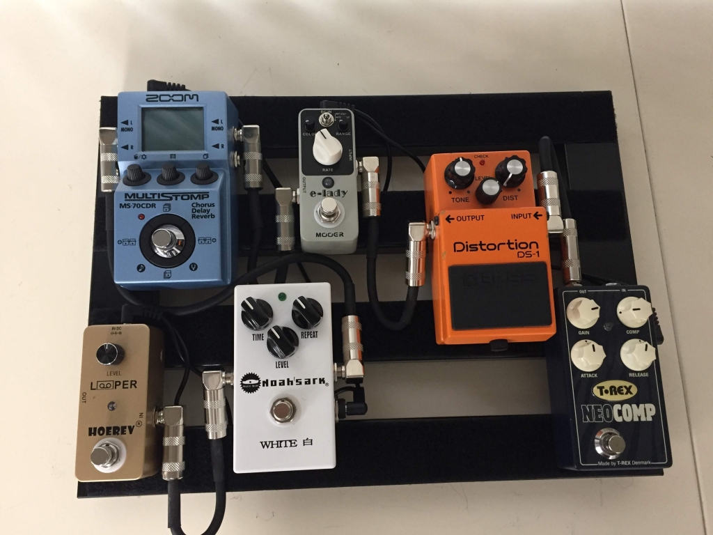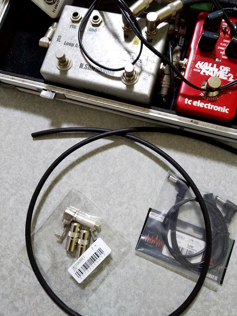 JUGEMテーマ:エレクトリックギター ↑ ケーブルはベルデン9395、コネクターはスイッチクラフト 機材いじりは楽しい イフェクターを1個増やしたから、どれかを外さないとな・・・ と思っていたんだが、どう考えても現実的ではないので ちょっと窮屈になったけどなんとか組み込んでみた ライブでの操作性を考慮すると、イフェクター同士が近いと どうしても踏み間違いやらが起きてくる(目が悪いってのもあるが) ↑ 左上よりLine6 Delay、DCアダプター、Bossトレモロ、Dunlopワウ(右) 右下より...