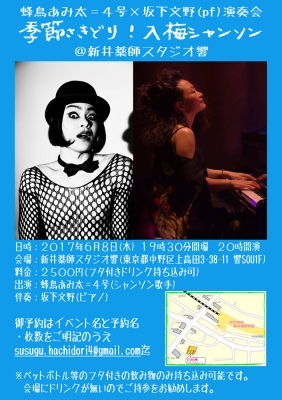 ボンジュール・トリステサ 先月も申しましたが年明けからの肉体改造の為に納豆・ヨーグルトなどの発酵食品からタンパク質を摂取しまくったせいか今年は鼻水もくしゃみもまだまだ全然出ませんでなんかマジで花粉症を克服してる感が出て来ましてその代償として命を落とすのではないかという恐怖に日々囚われております。いつも心に正負の法則を、小さな不幸を出来るだけあつめて致命傷をやり過ごしなんとかかんとか死なずに生きている地獄シャンソン歌手、蜂鳥あみ太です。 先日のワンマンでも終演後気付い...