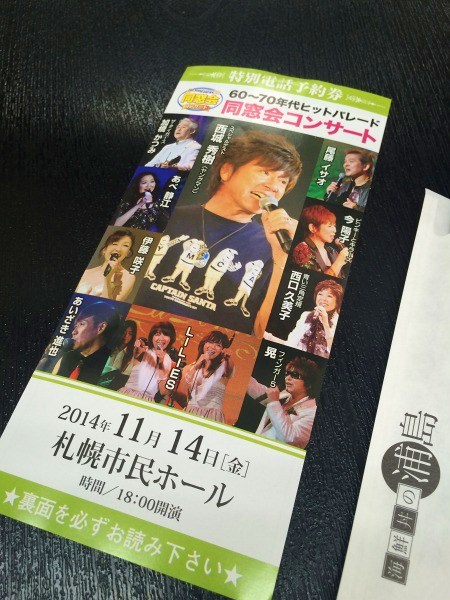 JUGEMテーマ:邦楽・懐メロ iPhone 5s 先日、東京から知人のsさんがご来店くださいました。 来月に開催される60~70年代ヒットパレード 「同窓会コンサート」のお仕事での来札でした。 出演者の顔ぶれが懐かしいですね。 この中のリリーズ(双子ちゃん)は私の1級下の後輩でして 小学校、中学校が同じでした。 ご活躍中で何よりです。 事前予約で5,400円の指定席が3,500円の特別料金になるそうです。 予約・お問い合わせは コンサート公演事務局 ☎03-5691-3661 by店主