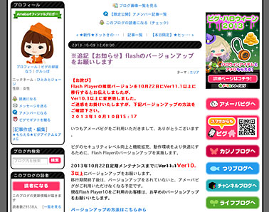 ピグのセキュリティレベル向上と機能拡充、動作環境をより快適にするために、Flash Playerのバージョンアップを実施します。 2013年10月22日定期メンテナンスまでにVer11.1Ver10.3以上にバージョンアップをお願いします。 移行期間終了後は、バージョンアップをされていないと、アメーバピグがご利用いただけなくなる予定です。 現在Flash Player10をご利用のお客様は、お早めのバージョンアップをお願いいたします。 ※「ピグライフ」「ピグアイランド」「ピグカフェ」「ピグワールド」はバージョンアップをしなくても引き続...