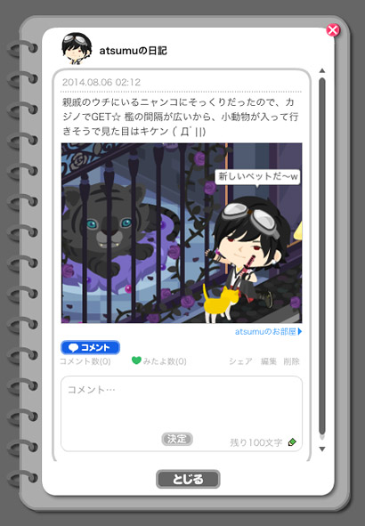 7月29日より、アメピグで日記が書ける新機能が実装された。 ★新機能★ピグで日記が書けるようになりました!! http://ameblo.jp/pigg-staff/entry-11898490137.html 御礼に使ったり、ピグで日々起こる出来事を書きとめたり、クイズに使ったりと、使い方は人によって様々。 投稿直後の記念キャプチャ♪ 日記にコメントを残すことも可能(追加機能でコメントの返信も出来る様になった)。FBでいう「いいね」機能と同類の「みたよ」が出来るなど、ブログの日記とほぼ同じである。記事の投稿から24時間以内にNEWマークが表示され...