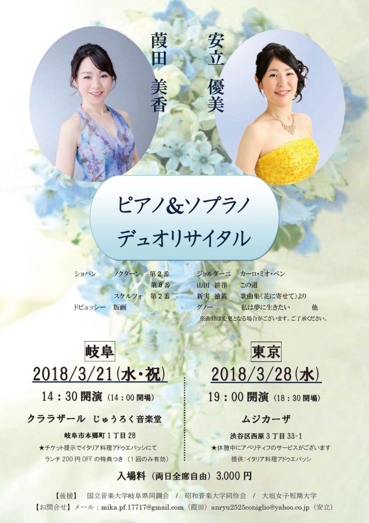 JUGEMテーマ:演奏会 今日はお休みの定休日でしたが、河合シェフは今後控える東京でのイベントの打ち合わせのために日帰りで東京へ。 私はいよいよ2週間と迫った、ピアニストの葭田美香さんとの歌とピアノのデュオリサイタルの音楽合わせがありました。 昨年秋から大きな演奏の機会に恵まれ、1回1回準備をする曲数も増え、練習と本番に日々追われてきましたが、 この3月の演奏会は私の中で一区切りのように思っています。 15歳で声楽を始めてから、これまで本当に色々なことがありました。 留...