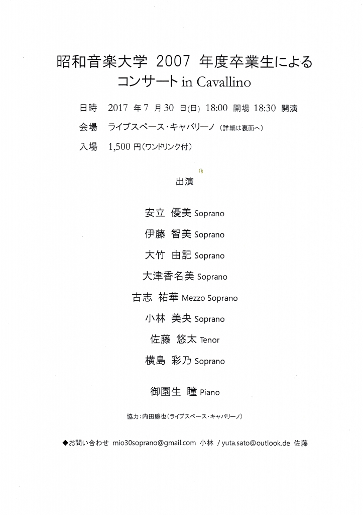JUGEMテーマ:演奏会 8/5のディナーコンサートの前にも店外音楽活動が1つ・・ 7/30㈰には昭和音楽大学の同級生とのコンサートがあります♪ 会場は埼玉県川口市にあるライブスペース・キャバリーノというお店で、 そちらも昭和音大の同期の友人がやっているお店になります。 私も初めて行く会場なのですが、JR川口駅東口より徒歩5分ということで、 うちのお店とは違ってアクセス抜群です!(^-^; 18:00開場、18:30開演、ワンドリンク付きで入場料は1,500円です。 同期とのコンサ...