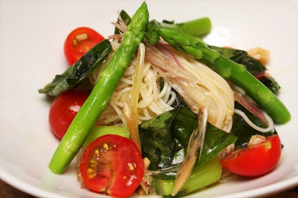 長引いた梅雨が明けた途端に連日の猛暑日、いやあ、参りますね。そんな時はあっさりと冷たい麺類を。グリーンアスパラガスとトマトの冷製そうめんです。これ、本当はカッペリーニのレシピなんですけど、おそうめんでもサイコーに旨旨ですよ。お蕎麦やうどんでも間違いなく美味しいです。特にお蕎麦はオリーブオイル、お塩、粉チーズでも旨旨ですから間違いないですよ。 ・にんにく(中サイズ)丸ごと1個分のみじん切り ・上記にんにくをオリーブオイルで焦がさない様に熱し、香りを引き出す。 ・上記オリーブオイルをタッパ...