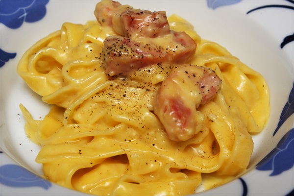 先日の事ではありかすが、夕食に家にある食材で何とか、、、と作った久々にカルボナーラであります。今回は平打ち生麺のフェットゥチーネで。 小さく切り分けたブロックベーコンをオリーブオイルでソテーし、火が通ったら火を止めて小麦粉をまぶしよく混ぜます。小麦粉が馴染んだら弱火で牛乳を加え小麦粉を伸ばし、とろみが付いたら粉チーズをバッサバッサとたくさん降り、お塩で味を整えます。ゆで汁少々と一緒に固めに茹でたフェットゥチーネを加え良く混ぜたら火を止め卵黄を加えて出来上がりです。 とろ〜り濃厚...